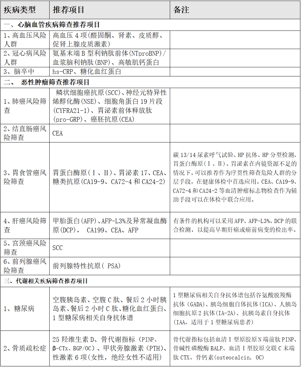 表1 共识推荐的涉及热景生物的成人个体化健康体检项目清单表