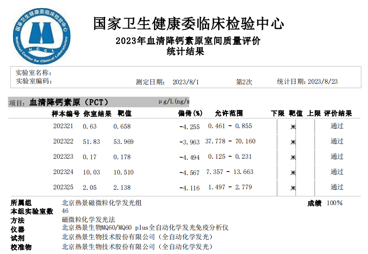 血清降钙素原(PCT)室间质评成绩单(UPT、CLIA平台)