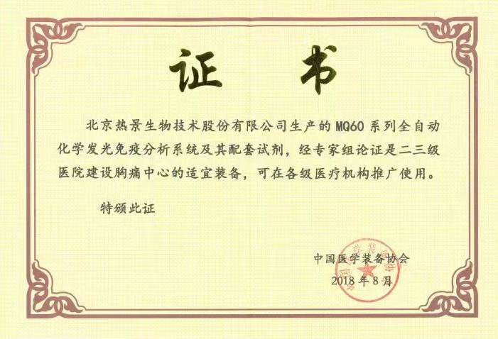 早在2018年,MQ60系列全自动化学发光免疫分析系统及其配套试剂通过中国医学装备协会组织国内检验、心内和急诊等领域知名专家技术论证,一致认为该设备满足急诊对高质量检测结果的要求,性能稳定可靠,操作简单快速,符合质控要求,不依赖其它设备或繁琐前处理,可对各类样品进行检测,满足二三级医院建设胸痛中心的要求,适合各级医疗机构推广应用。