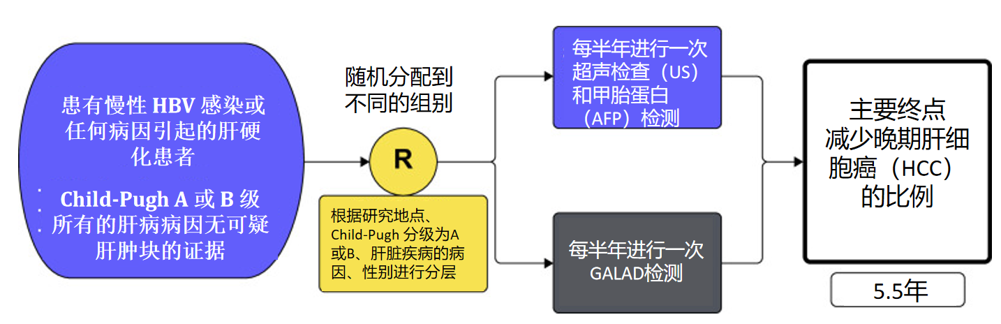 为了验证GALAD模型在真实世界中的临床应用效果,美国国家癌症研究所(NCI)牵头开展了TRACER试验。TRACER 研究是一项实用的随机 IV 期试验,旨在比较基于超声的筛查与生物标志物组合 GALAD 在患有慢性 HBV 感染或任何病因引起的肝硬化患者中的应用。简而言之,5500 名患者以 1:1 的方式随机分配到 A 组,建议每半年进行一次超声 ± AFP 筛查,或 B 组,建议每半年进行一次 GALAD 筛查。按地点、Child-Pugh 分级(A 与 B)、肝病病因(病毒性、非病毒性和非肝硬化性 HBV 感染)和性别进行随机分层。通过对比两组的结果,研究人员希望能够确定哪种方法能更好地减少晚期肝癌的发现率,并改善患者的治疗效果。