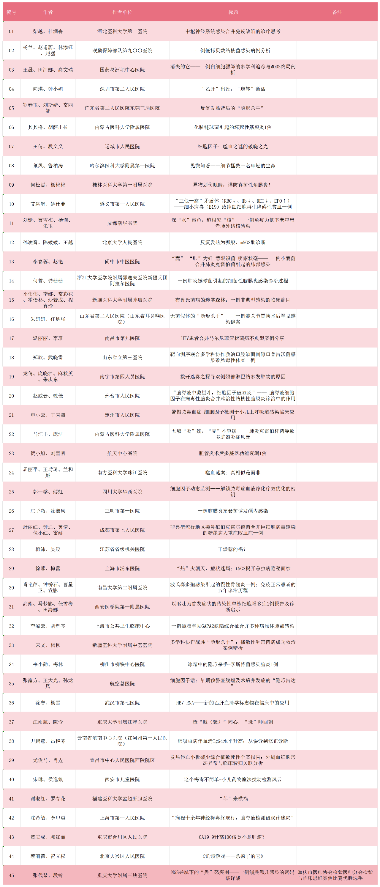 为了有效推动检验与临床的深度融合,进一步提升检验人员的临床思维能力,在中华医学会检验医学分会青年学组指导下,西部数智医疗研究院、《检验医学》杂志、检验医学新媒体主办,白求恩精神研究会检验医学分会细胞因子与疾病检测学组、球盟会·(中国)-官方网站协办的「第五届检验与临床(感染性疾病)思维案例展示活动」已全面启动。在面向全国进行征稿,并对稿件进行双盲双审(同一篇稿件均由2位专家进行评审)后,根据评审结果,共纳入复审稿件45篇。以下为详细名单,排名不分先后。