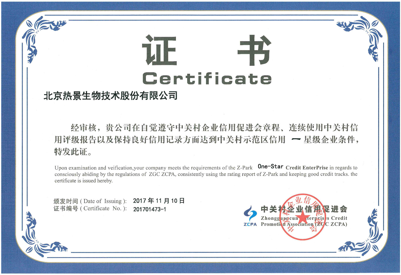 中关村信用促进会信用星级评定证书一星级